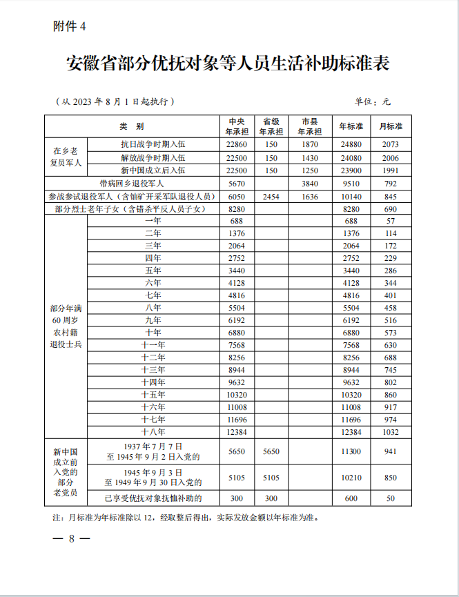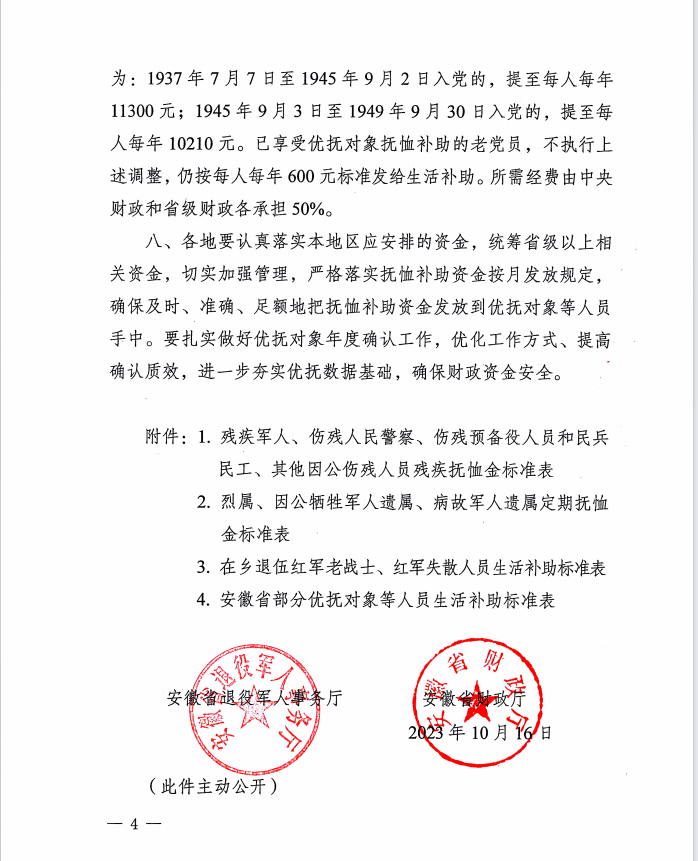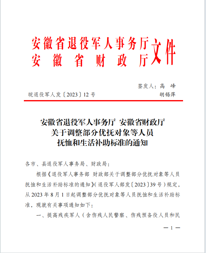 抚恤和生活补助标准的通知(皖退役军人发〔2023〕12 号)