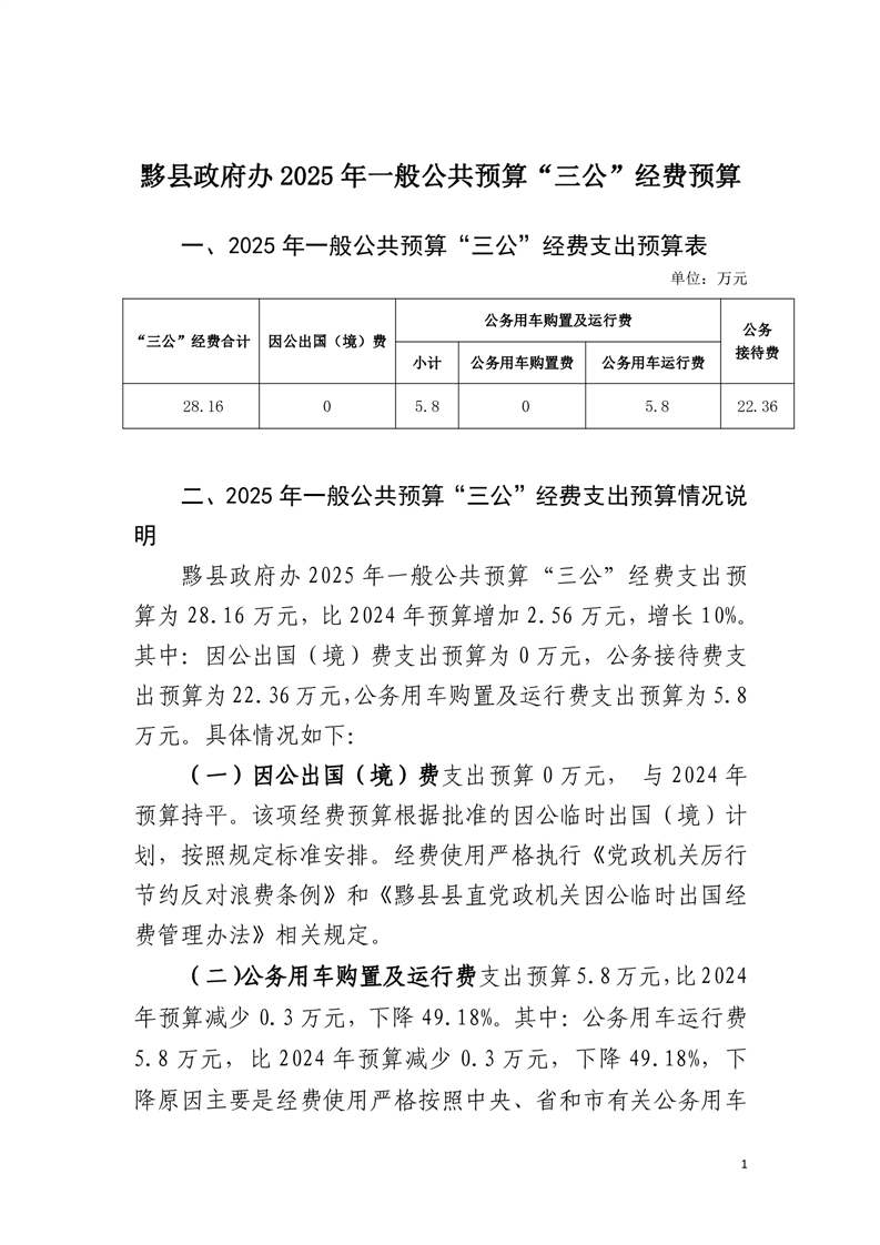 黟县政府办2025年一般公共预算“三公”经费预算