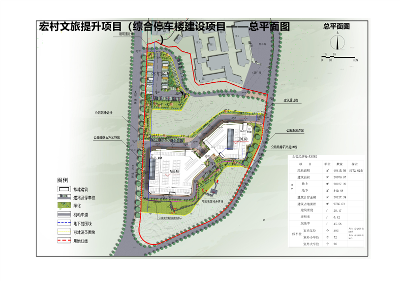 宏村文旅提升项目(综合停车楼建设项目)位于宏村镇际村村,国道530与省道476交叉口,建设单位黟县宏村印象旅游投资有限公司。项目总用地面积48415.59㎡,规划总建筑面积20676.87㎡,其中计容建筑面积20127.39㎡,容积率0.42。