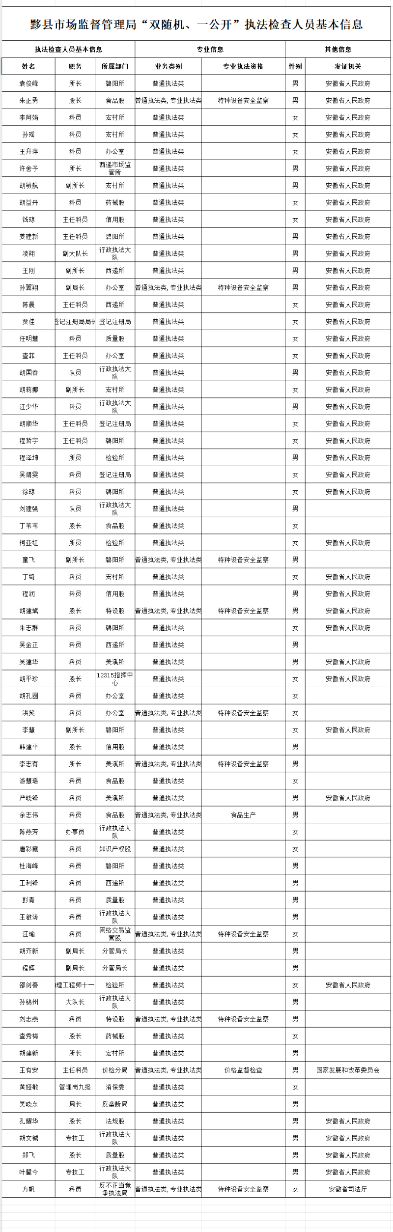 2025年度黟县市场监督管理局“双随机、一公开”执法检查人员基本信息