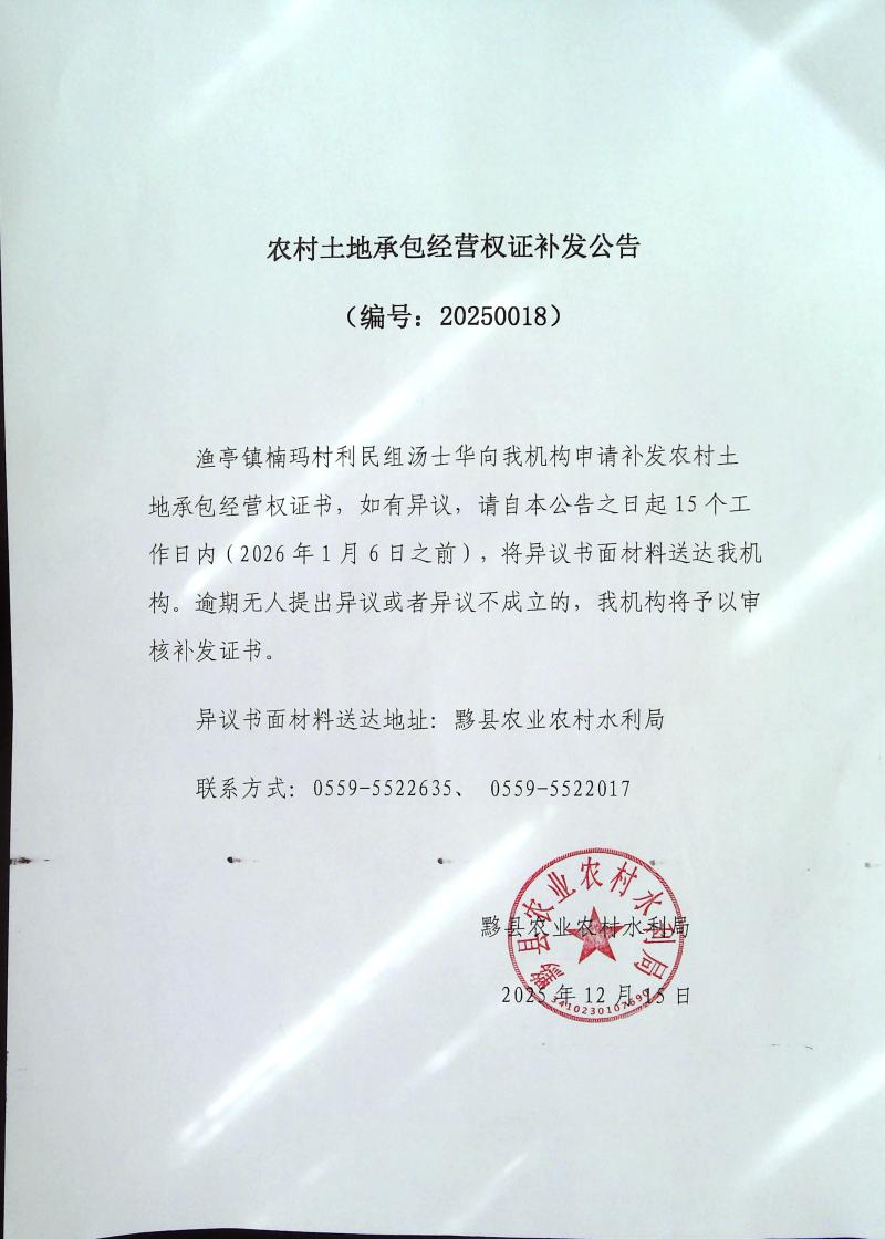 农村土地承包经营权证补发公告(编号:20250018)