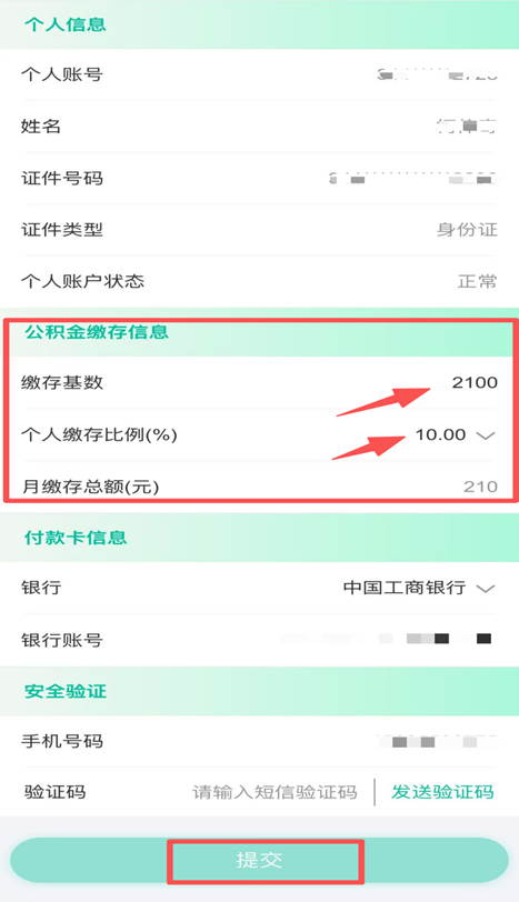第四步:点击“发送验证码”后输入验证码,点击提交即可完成缴存信息调整。