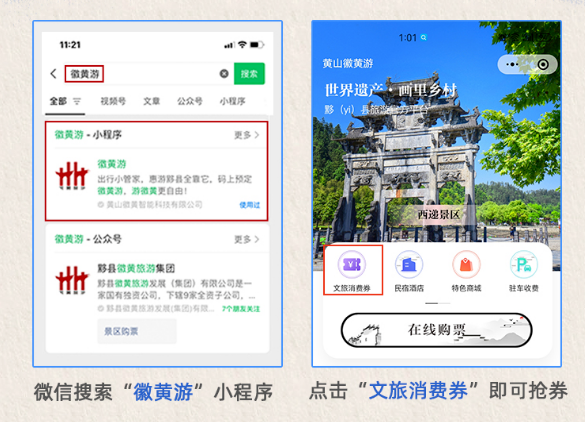 活动期间,市民和游客可通过微信搜索“徽黄游”小程序,首页点击【消费券】进入抢券页面,领取满减消费券。每类消费场所的消费券限领一张,领券成功后可到参与活动的指定商户使用消费券抵扣消费。