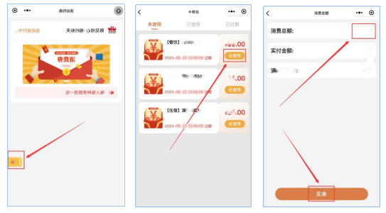 在有效期内到活动参与商户消费时,打开“券包”选择对应类型的消费券,点击“使用”并扫描商家的专用核销码,在消费页面输入实际消费总金额,系统将自动抵扣消费券金额,点击“买单”输入支付密码,即完成抵扣支付。