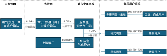 上游气源:气源来自“川气东送”一线宣城分输站,经省级管网长输管线输送至休宁-黟县-祁门支线分输站;