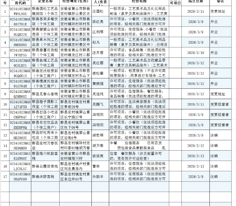 宏村所营业执照基本信息(2026年3月9日-2026年3月13日)