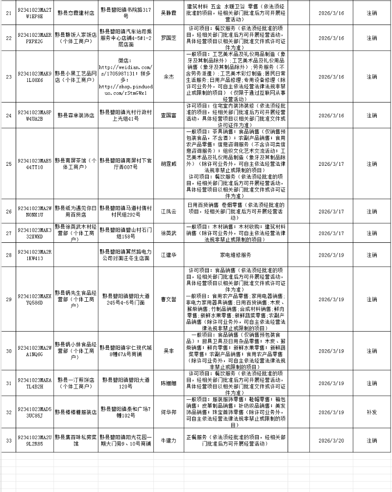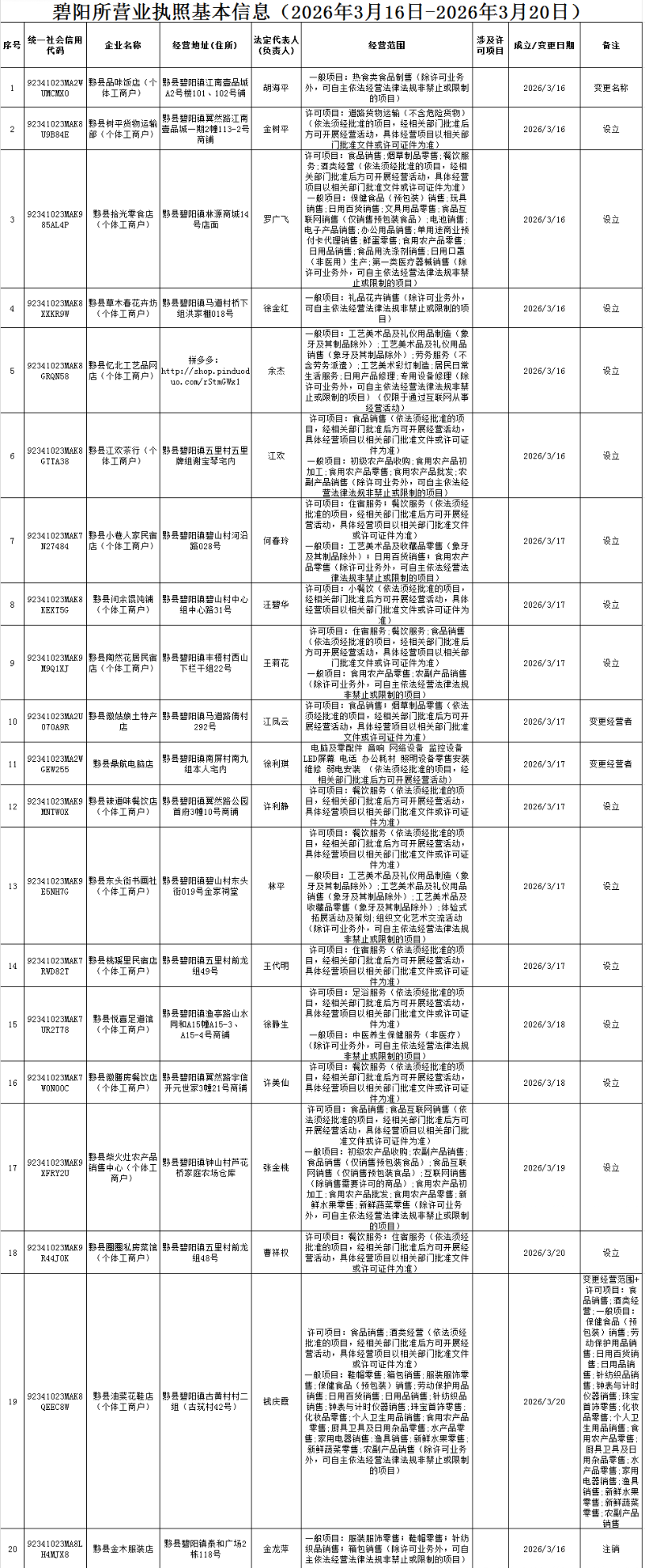 碧阳所营业执照基本信息(2026年3月16日-2026年3月20日)