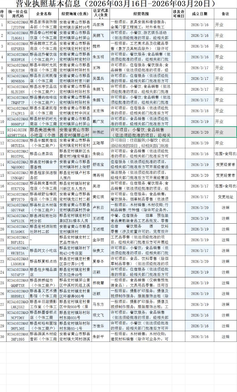 宏村所营业执照基本信息(2026年3月16日-2026年3月20日)