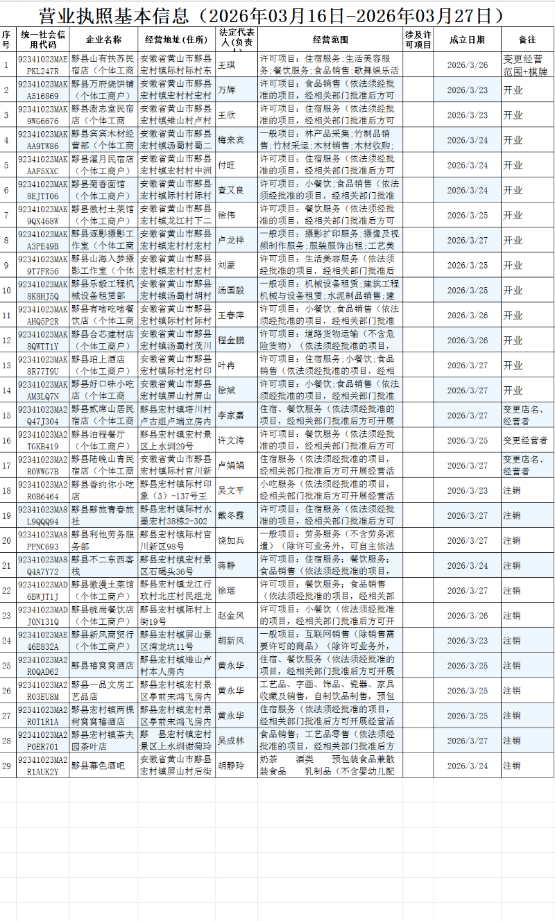 宏村所营业执照基本信息(2026年3月23日-2026年3月27日)