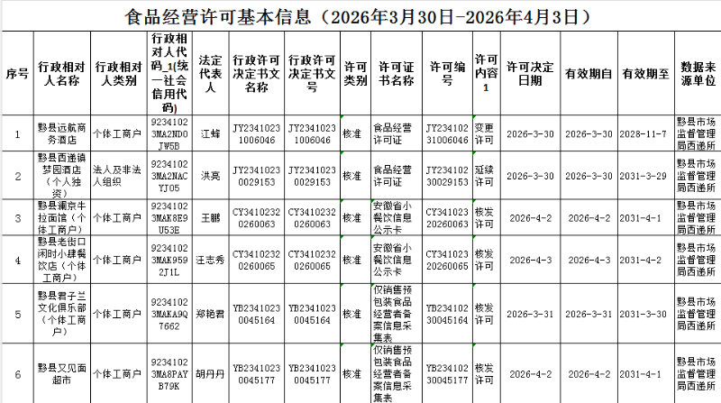 西递所食品经营许可基本信息(2026年3月30日-2026年4月3日)