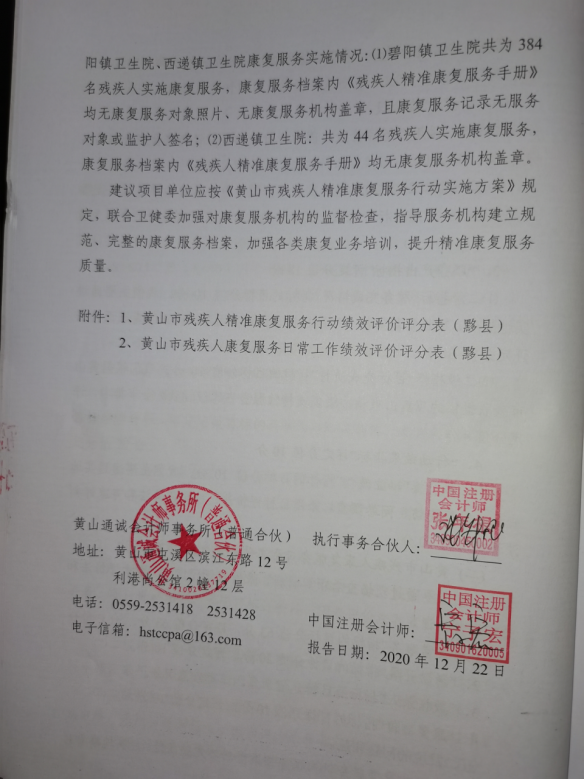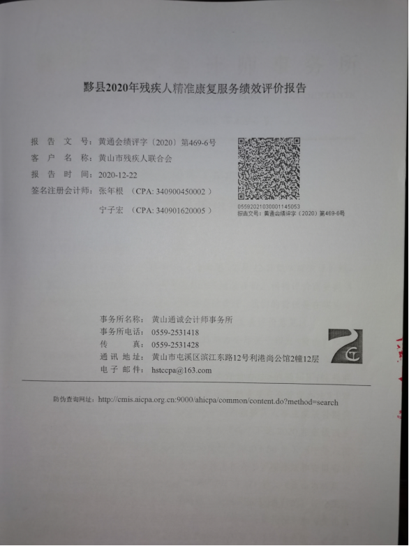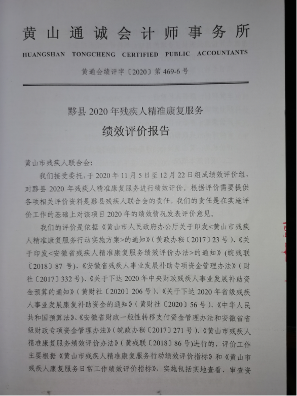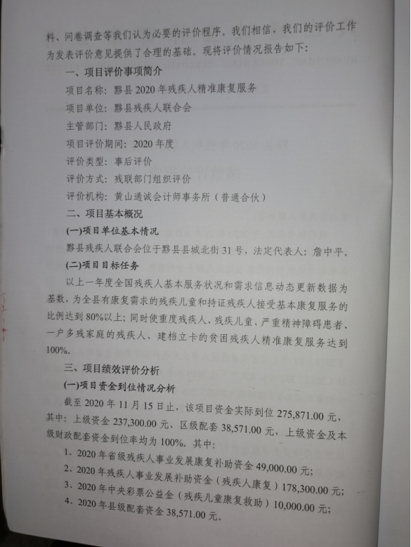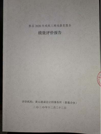 (三)绩效评价工作过程。该项目绩效评价由市残联统一委托第三方“黄山通诚会计师事务所(普通合伙)”于2020年11月12日对黟县2020年贫困残疾人康复民生工程进行绩效评价。