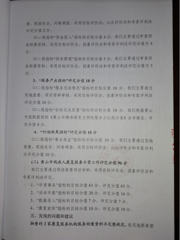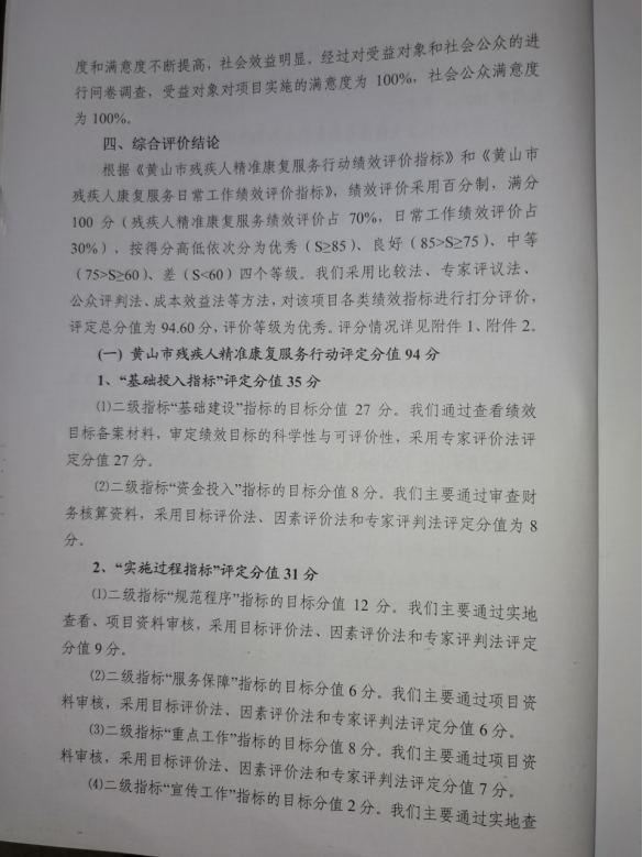 根据《黄山市贫困残疾人康复民生工程绩效评价指标》和《黄山市贫困残疾人康复民生工程日常绩效评价内容及标准》,绩效评价采用百分制,满分100分(贫困残疾人康复民生工程分值占70%,日常绩效评价占30%),按得分高低依次分为优秀、良好、中等、差四个等级。评价等级为优秀。贫困残疾人康复民生工程绩效评价得分:99分(详见附表)