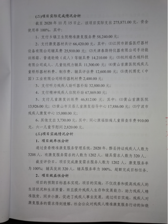 (一)项目概况。根据《关于印发2020年<黄山市贫困残疾人康复实施办法>的通知》(黄残联〔2020〕12号)、《黄山市人民政府关于建立残疾儿童康复救助的实施意见》(黄政〔2018〕54号)文件,实施贫困残疾人康复民生工程(贫困精神残疾人药费补助、贫困残疾儿童抢救性康复),贫困残疾人康复目标任务是为147名贫困精神残疾人提供药费补助;为10名听障、脑瘫、智障、孤独症儿童提供康复训练;为2名肢体残疾儿童装配假肢矫形器,为1名肢体残疾儿童适配辅具。项目资金投入万元,资金到位率、支付率100%。