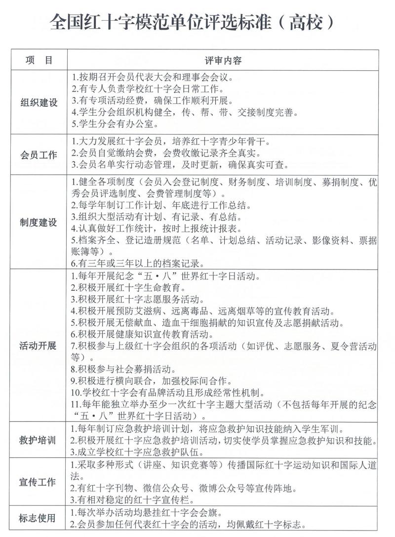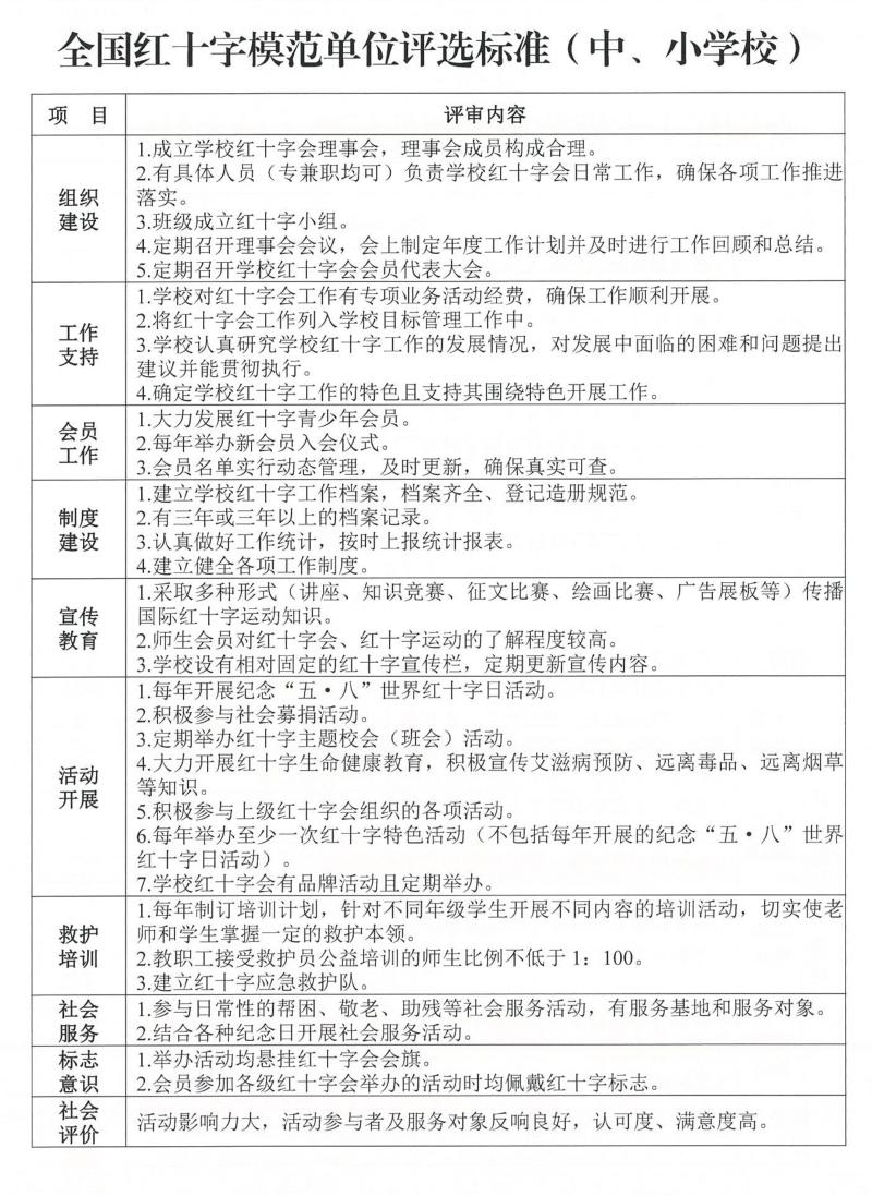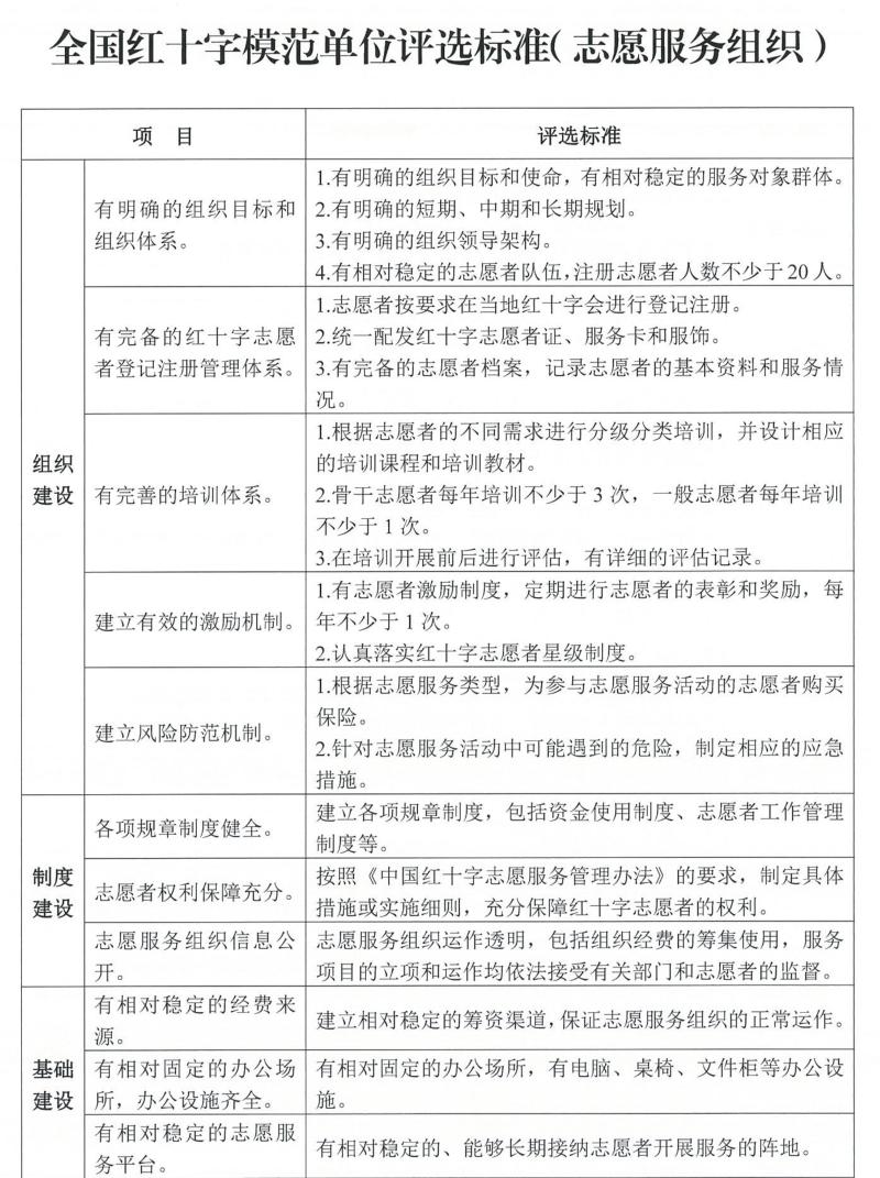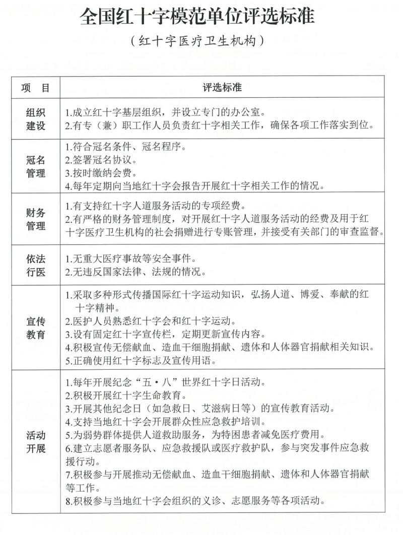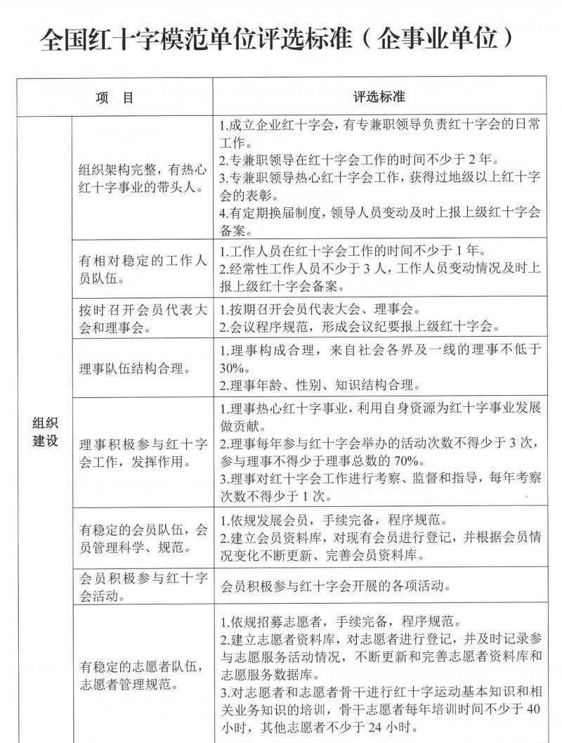 为深入贯彻落实中国红十字会总会关于加强基层组织建设、动员社会力量参与红十字事业的相关部署要求,有效推动红十字会基层组织、服务阵地和工作覆盖,着力打造“群众身边的红十字会”,近日,《中国红十字会总会办公室关于组织开展全国红十字模范单位推荐评选表彰工作的通知》(中红办〔2025〕24号)中印发了《全国红十字模范单位评选标准》,现在此摘要转发,供学习交流参考,做好推广运用。