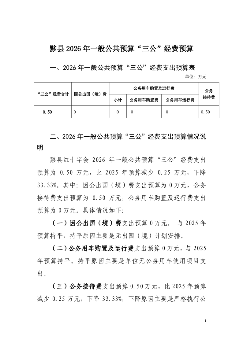 黟县红十字会2026年一般公共预算“三公”经费预算