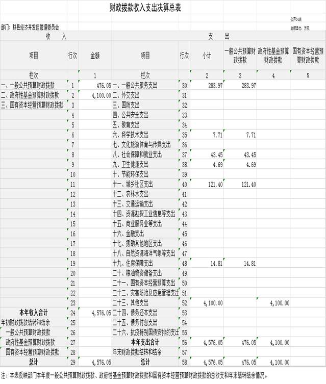 2023年度财政拨款收入总计4576.05万元(含年初财政拨款结转和结余),支出总计4576.05万元(含年末财政拨款结转和结余)。与2022年相比,财政拨款收、支总计各减少8859.84万元,下降65.94%,主要原因:代支国有企业专项债减少。