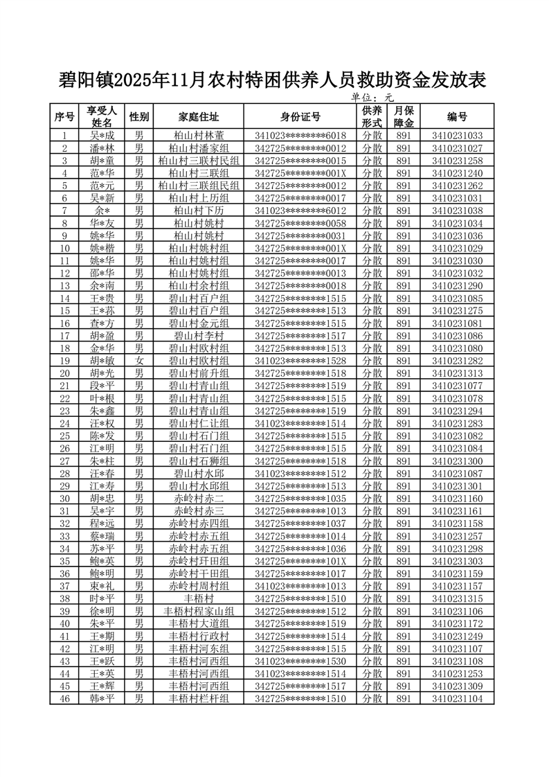 碧阳镇2025年11月农村特困供养人员救助资金发放表