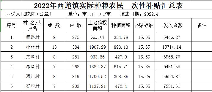 西递镇2022年实际种粮农民一次性补贴