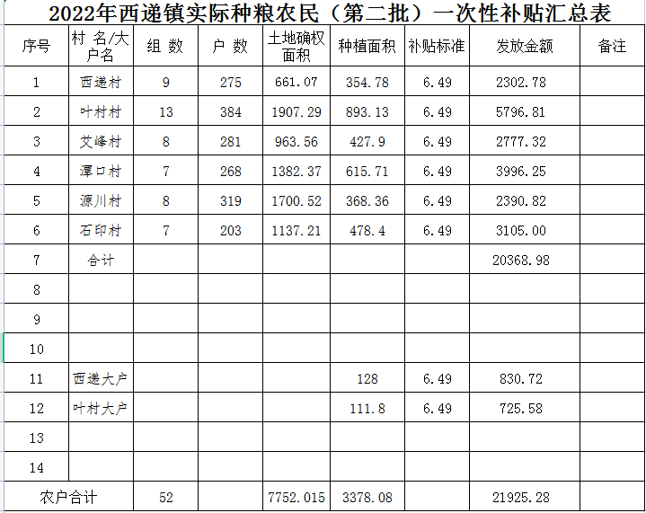 2022年西递镇实际种粮农民(第二批)一次性补贴汇总表