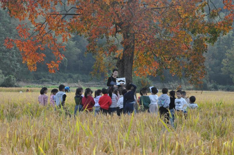 田园拾趣。小班/小小班 开展亲子共同漫步稻田拾穗活动,用落叶装饰面具,手持风向袋嬉戏,并在野餐故事会中聆听故事,加深对本土农耕文化与自然生态的认知和情感体验。