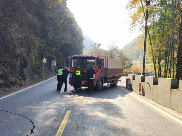 12月4日上午,黟县交通运输执法大队在渔亭镇开展执法活动后返程途中,在国道G530桃源洞路段发现一辆两轴货车异常停在道路中间。