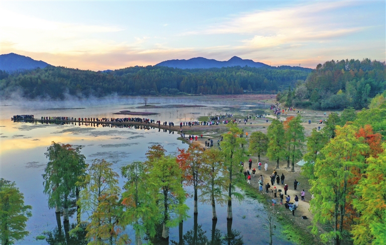 11月19日,位于黟县宏村镇奇墅湖畔的水杉林进入最佳观赏期。早晨,水雾蒸腾,鎏金般的霞光洒满湖面,熠熠生辉,游客徜徉其间,宛如置身仙境,流连忘返。