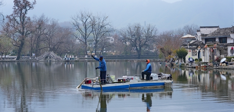 1月5日,在黟县宏村景区,工作人员正在进行清淤作业。据了解,为加强村落水系环境养护,宏村景区于本月4日至25日,对南湖区域开展生态清淤施工,以此确保宏村水系四季清澈。