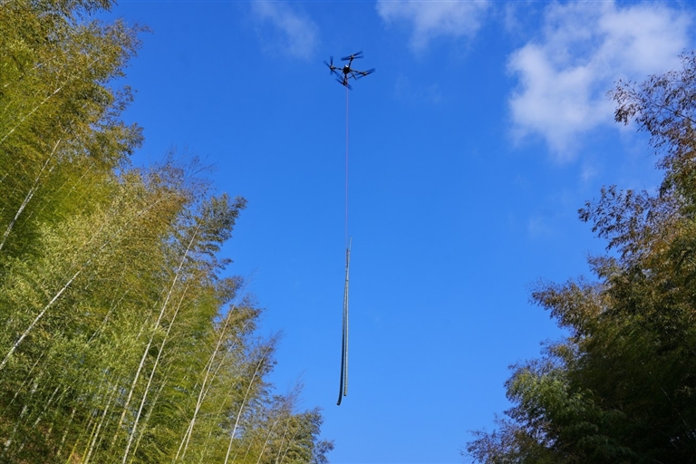 2月2日,黟县宏村镇星光村,当地竹农引进无人机服务队,将毛竹从山间转运下山,此举大大提升了竹材运出效率。