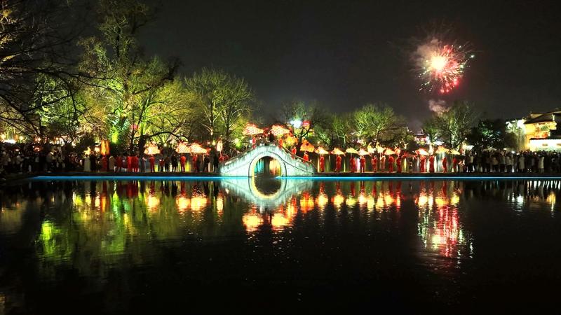 假日的宏村内外张灯结彩、红灯高挂,南湖畔、画桥上、月沼边游人络绎不绝。景区内民俗活动精彩纷呈,传统舞麒麟、近景徽剧、民俗巡游轮番上阵,手写春联、花灯制作等体验项目游客热情参与。夜幕降临,花灯队员身着特色服饰手持马灯、鱼灯、兔灯等各类花灯,循鼓点起舞,流光溢彩点亮古村街巷,游客们参与巡游,沉浸式感受徽州年俗魅力。